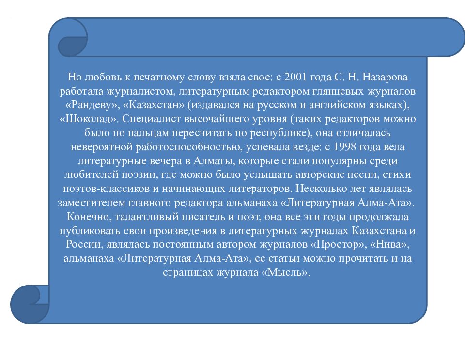Но любовь к печатному слову взяла свое: с 2001 года С. Н. Назарова работала журналистом, литературным редактором глянцевых журналов «Рандеву», «Казахстан» (издавался на русском и английском языках), «Шоколад». Специалист высочайшего уровня (таких редакторов можно было по пальцам пересчитать по республике), она отличалась невероятной работоспособностью, успевала везде: с 1998 года вела литературные вечера в Алматы, которые стали популярны среди любителей поэзии, где можно было услышать авторские песни, стихи поэтов-классиков и начинающих литераторов. Несколько лет являлась заместителем главного редактора альманаха «Литературная Алма-Ата». Конечно, талантливый писатель и поэт, она все эти годы продолжала публиковать свои произведения в литературных журналах Казахстана и России, являлась постоянным автором журналов «Простор», «Нива», альманаха «Литературная Алма-Ата», ее статьи можно прочитать и на страницах журнала «Мысль».