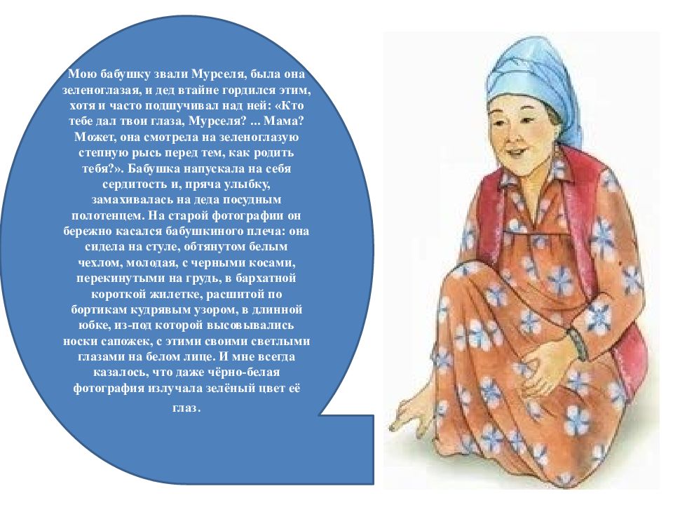 Мою бабушку звали Мурселя, была она зеленоглазая, и дед втайне гордился этим, хотя и часто подшучивал над ней: «Кто тебе дал твои глаза, Мурселя ?... Мама? Может, она смотрела на зеленоглазую степную рысь перед тем, как родить тебя?». Бабушка напускала на себя сердитость и, пряча улыбку, замахивалась на деда посудным полотенцем. На старой фотографии он бережно касался бабушкиного плеча: она сидела на стуле, обтянутом белым чехлом, молодая, с черными косами, перекинутыми на грудь, в бархатной короткой жилетке, расшитой по бортикам кудрявым узором, в длинной юбке, из-под которой высовывались носки сапожек, с этими своими светлыми глазами на белом лице. И мне всегда казалось, что даже чёрно-белая фотография излучала зелёный цвет её глаз.