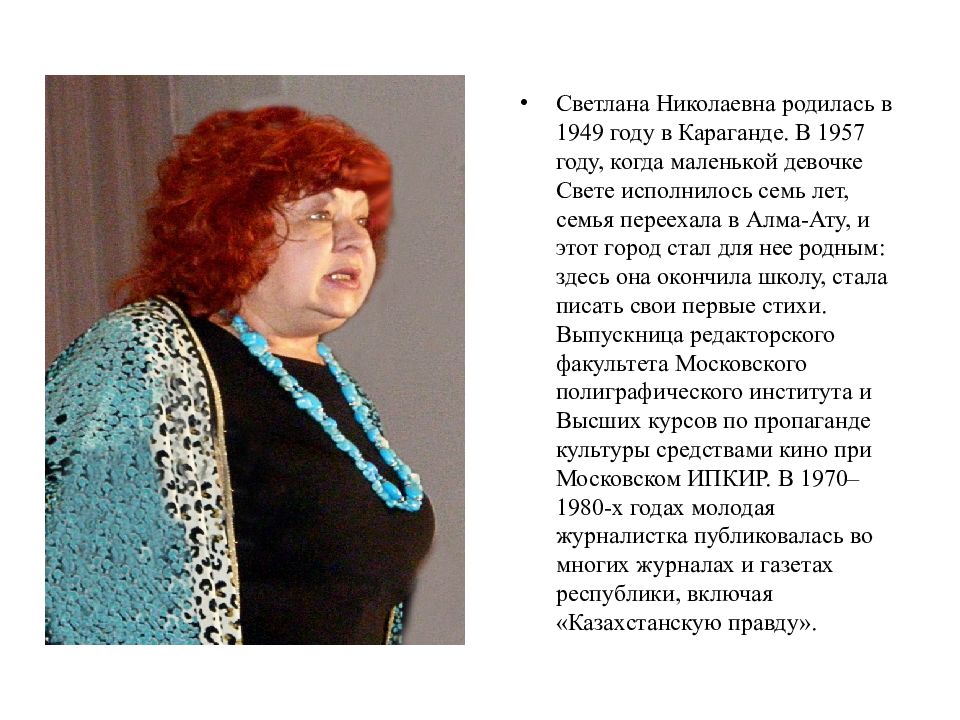 Светлана Николаевна родилась в 1949 году в Караганде. В 1957 году, когда маленькой девочке Свете исполнилось семь лет, семья переехала в Алма-Ату, и этот город стал для нее родным: здесь она окончила школу, стала писать свои первые стихи. Выпускница редакторского факультета Московского полиграфического института и Высших курсов по пропаганде культуры средствами кино при Московском ИПКИР. В 1970–1980-х годах молодая журналистка публиковалась во многих журналах и газетах республики, включая «Казахстанскую правду».