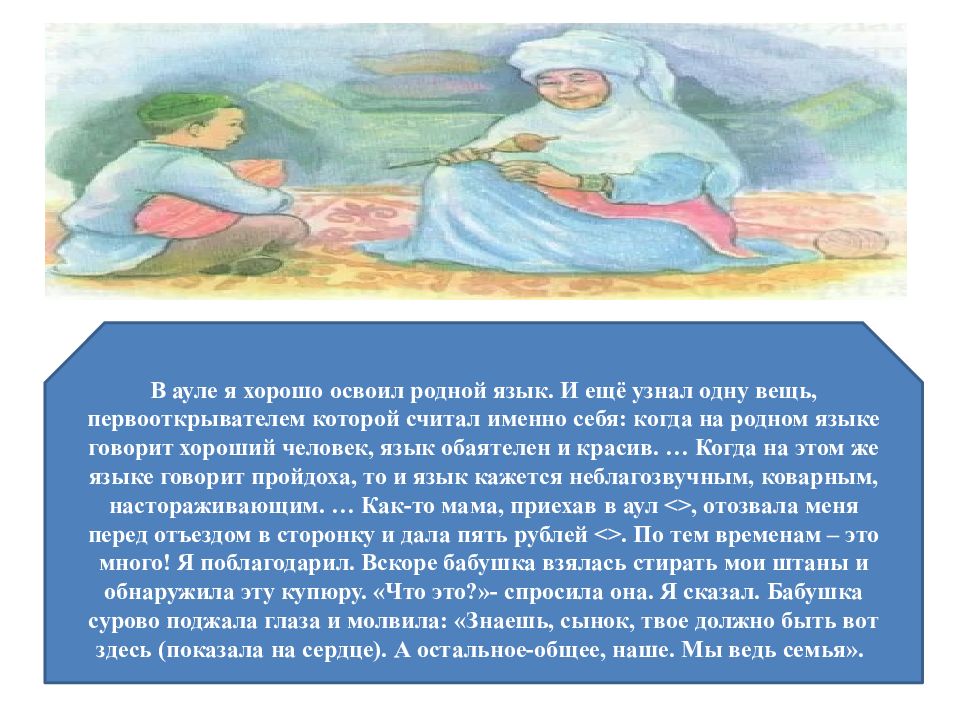 В ауле я хорошо освоил родной язык. И ещё узнал одну вещь, первооткрывателем которой считал именно себя: когда на родном языке говорит хороший человек, язык обаятелен и красив. … Когда на этом же языке говорит пройдоха, то и язык кажется неблагозвучным, коварным, настораживающим. … Как-то мама, приехав в аул <>, отозвала меня перед отъездом в сторонку и дала пять рублей <>. По тем временам – это много! Я поблагодарил. Вскоре бабушка взялась стирать мои штаны и обнаружила эту купюру. «Что это?»- спросила она. Я сказал. Бабушка сурово поджала глаза и молвила: «Знаешь, сынок, твое должно быть вот здесь (показала на сердце). А остальное-общее, наше. Мы ведь семья».