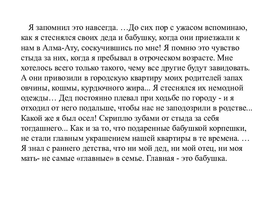 Я запомнил это навсегда. …До сих пор с ужасом вспоминаю, как я стеснялся своих деда и бабушку, когда они приезжали к нам в Алма-Ату, соскучившись по мне! Я помню это чувство стыда за них, когда я пребывал в отроческом возрасте. Мне хотелось всего только такого, чему все другие будут завидовать. А они привозили в городскую квартиру моих родителей запах овчины, кошмы, курдючного жира... Я стеснялся их немодной одежды… Дед постоянно плевал при ходьбе по городу - и я отходил от него подальше, чтобы нас не заподозрили в родстве... Какой же я был осел ! Скриплю зубами от стыда за себя тогдашнего... Как и за то, что подаренные бабушкой корпешки, не стали главным украшением нашей квартиры в те времена. …Я знал с раннего детства, что ни мой дед, ни мой отец, ни моя мать- не самые «главные» в семье. Главная - это бабушка.