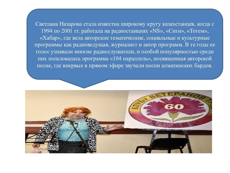 Светлана Назарова стала известна широкому кругу казахстанцев, когда с 1994 по 2001 гг. работала на радиостанциях «NS», «Сити», «Тотем», «Хабар», где вела авторские тематические, социальные и культурные программы как радиоведущая, журналист и автор программ. В те годы ее голос узнавали многие радиослушатели, и особой популярностью среди них пользовалась программа «104 параллель», посвященная авторской песне, где впервые в прямом эфире звучали песни алматинских бардов.