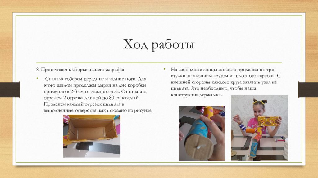 8. Приступаем к сборке нашего жирафа: -Сначала соберем передние и задние ноги. Для этого шилом проделаем дырки на дне коробки примерно в 2-3 см от каждого угла. От шпагата отрежем 2 отрезка длиной по 80 см каждый. Проденем каждый отрезок шпагата в выполненные отверстия, как показано на рисунке. На свободные концы шпагата проденем по три втулки, а закончим кругом из плотного картона. С внешней стороны каждого круга завязать узел из шпагата. Это необходимо, чтобы наша конструкция держалась.