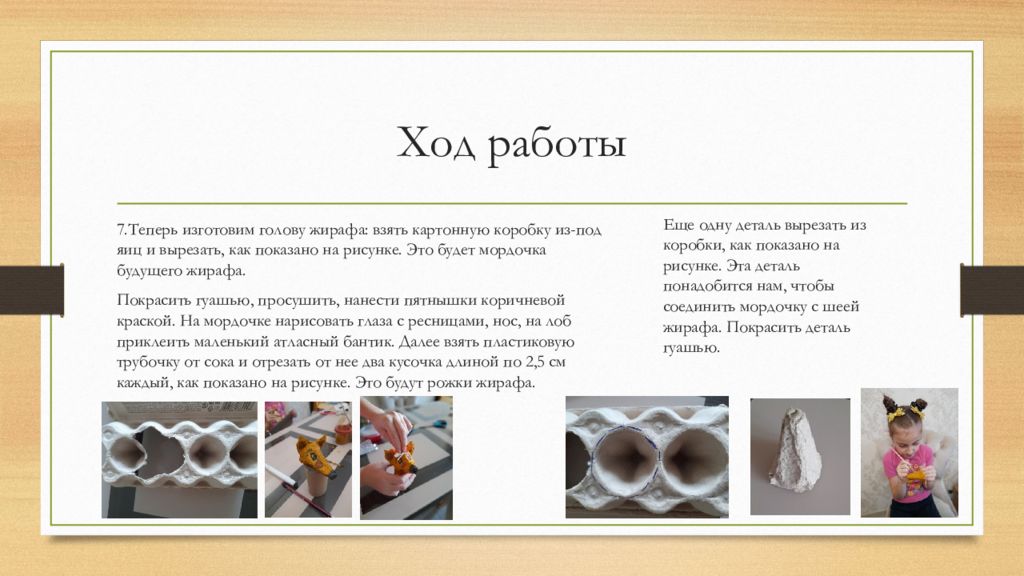7.Теперь изготовим голову жирафа: взять картонную коробку из-под яиц и вырезать, как показано на рисунке. Это будет мордочка будущего жирафа. Покрасить гуашью, просушить, нанести пятнышки коричневой краской. На мордочке нарисовать глаза с ресницами, нос, на лоб приклеить маленький атласный бантик. Далее взять пластиковую трубочку от сока и отрезать от нее два кусочка длиной по 2,5 см каждый, как показано на рисунке. Это будут рожки жирафа. Еще одну деталь вырезать из коробки, как показано на рисунке. Эта деталь понадобится нам, чтобы соединить мордочку с шеей жирафа. Покрасить деталь гуашью.