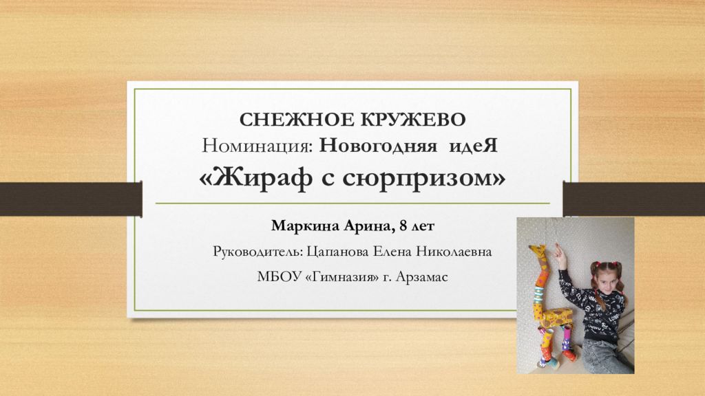 Последний слайд презентации: СНЕЖНОЕ КРУЖЕВО Номинация : Новогодняя идеЯ «Жираф с сюрпризом»: Демонстрация результата работы