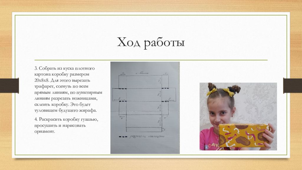 3. Собрать из куска плотного картона коробку размером 20х8х8. Для этого вырезать трафарет, согнуть по всем прямым линиям, по пунктирным линиям разрезать ножницами, склеить коробку. Это будет туловищем будущего жирафа. 4. Раскрасить коробку гуашью, просушить и нарисовать орнамент.