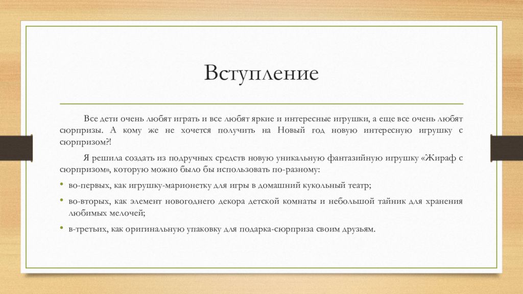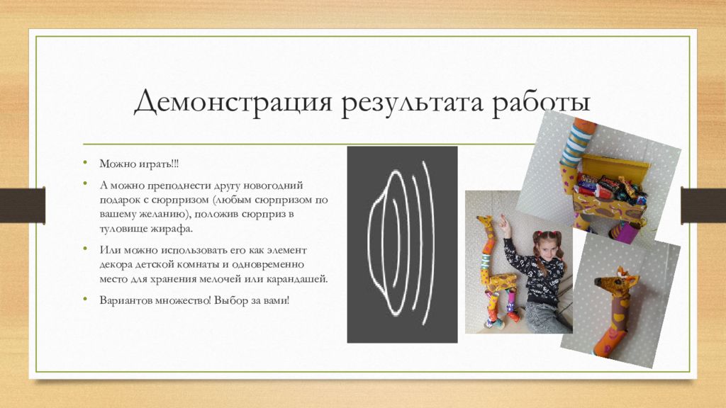 Все дети очень любят играть и все любят яркие и интересные игрушки, а еще все очень любят сюрпризы. А кому же не хочется получить на Новый год новую интересную игрушку с сюрпризом?! Я решила создать из подручных средств новую уникальную фантазийную игрушку «Жираф с сюрпризом», которую можно было бы использовать по-разному: во-первых, как игрушку-марионетку для игры в домашний кукольный театр ; во-вторых, как элемент новогоднего декора детской комнаты и небольшой тайник для хранения любимых мелочей; в-третьих, как оригинальную упаковку для подарка-сюрприза своим друзьям.