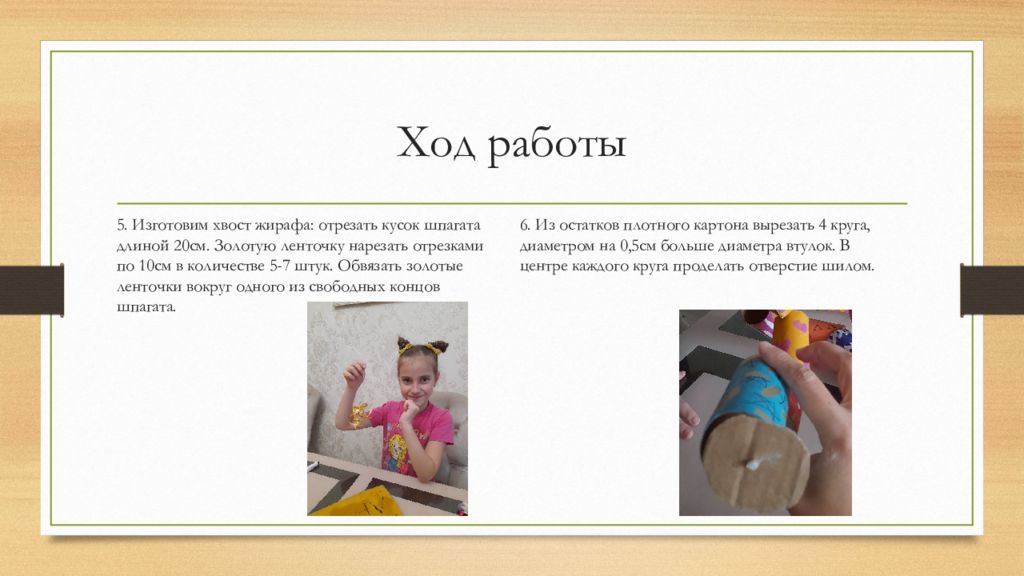 5. Изготовим хвост жирафа: отрезать кусок шпагата длиной 20см. Золотую ленточку нарезать отрезками по 10см в количестве 5-7 штук. Обвязать золотые ленточки вокруг одного из свободных концов шпагата. 6. Из остатков плотного картона вырезать 4 круга, диаметром на 0,5см больше диаметра втулок. В центре каждого круга проделать отверстие шилом.