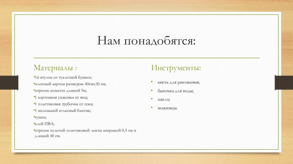 Материалы : 16 втулок от туалетной бумаги; плотный картон размером 40смх30 см; отрезок шпагата длиной 5м ; 1 картонная упаковка от яиц; 1 пластиковая трубочка от сока; 1 маленький атласный бантик; гуашь; клей ПВА; отрезок золотой пластиковой ленты шириной 0,5 см и длиной 40 см. Инструменты: кисть для рисования; баночка для воды; шило; ножницы.