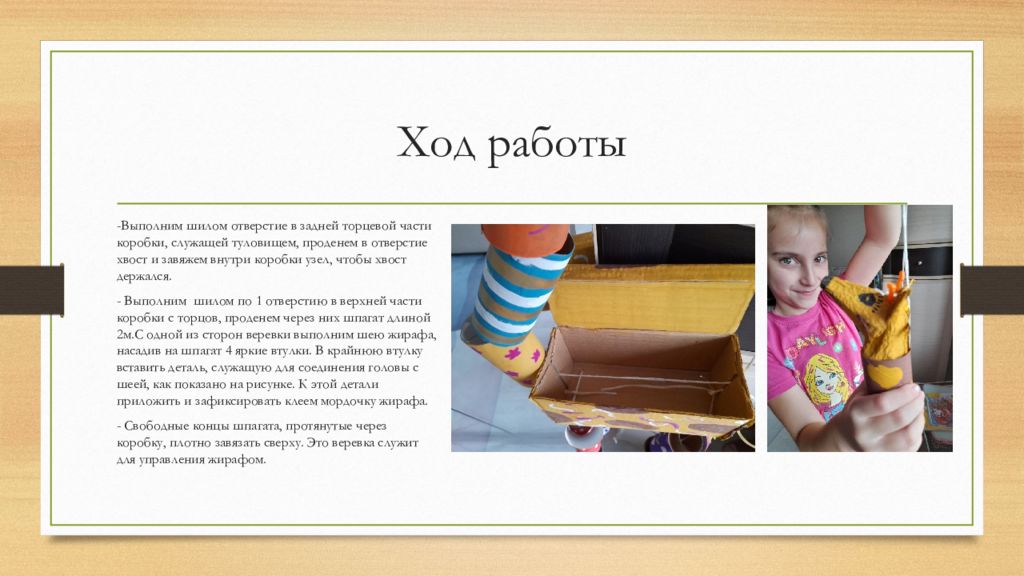 -Выполним шилом отверстие в задней торцевой части коробки, служащей туловищем, проденем в отверстие хвост и завяжем внутри коробки узел, чтобы хвост держался. - Выполним шилом по 1 отверстию в верхней части коробки с торцов, проденем через них шпагат длиной 2м.С одной из сторон веревки выполним шею жирафа, насадив на шпагат 4 яркие втулки. В крайнюю втулку вставить деталь, служащую для соединения головы с шеей, как показано на рисунке. К этой детали приложить и зафиксировать клеем мордочку жирафа. - Свободные концы шпагата, протянутые через коробку, плотно завязать сверху. Это веревка служит для управления жирафом.