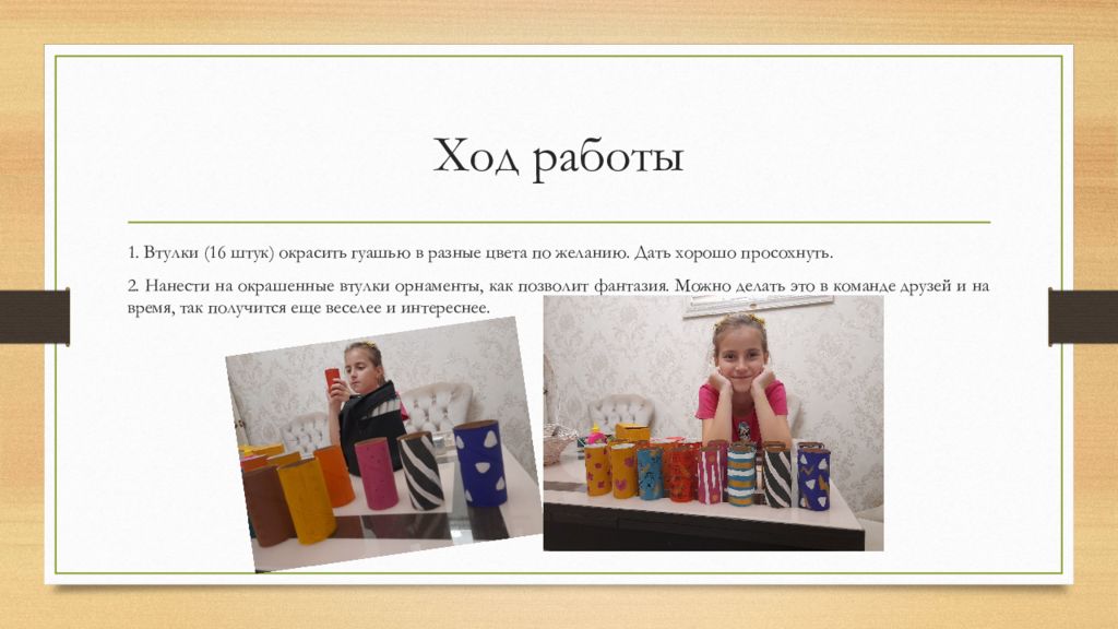 1. Втулки (16 штук) окрасить гуашью в разные цвета по желанию. Дать хорошо просохнуть. 2. Нанести на окрашенные втулки орнаменты, как позволит фантазия. Можно делать это в команде друзей и на время, так получится еще веселее и интереснее.