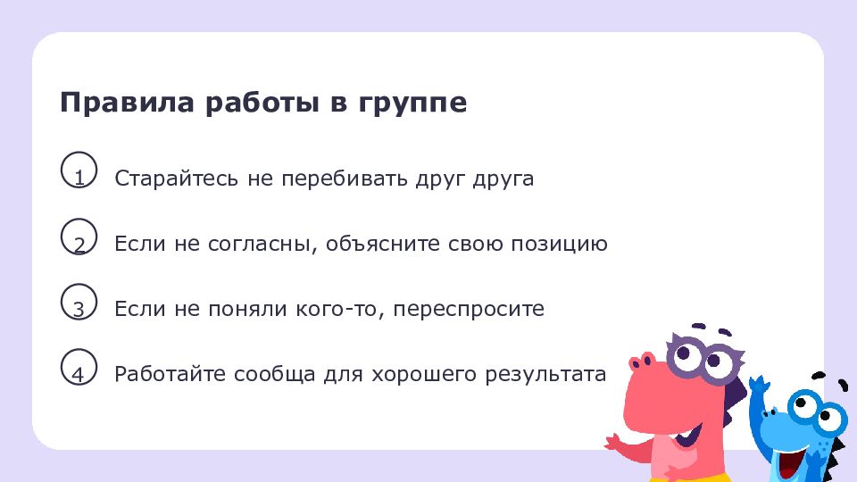 Правила работы в группе 1 2 Если не согласны, объясните свою позицию 3 Если не поняли кого-то, переспросите 4 Работайте сообща для хорошего результата Старайтесь не перебивать друг друга