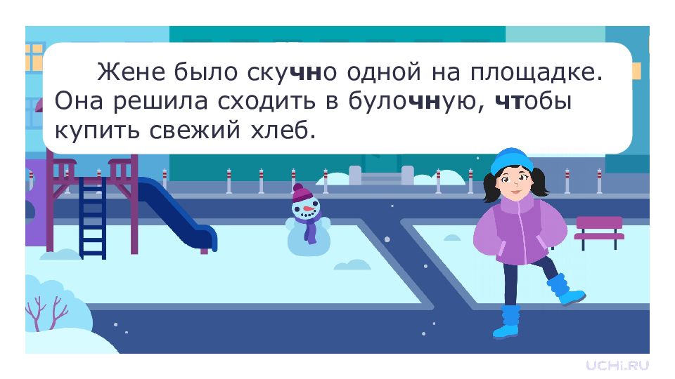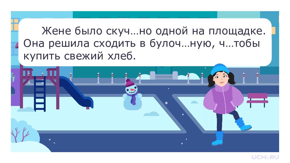 Жене было скуч…но одной на площадке. Она решила сходить в булоч…ную, ч…тобы купить свежий хлеб.