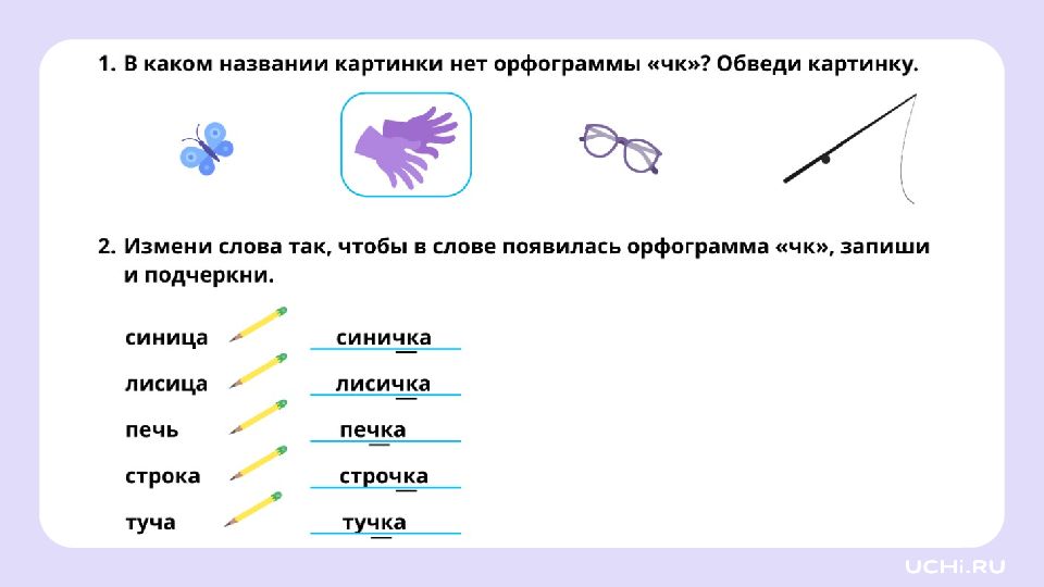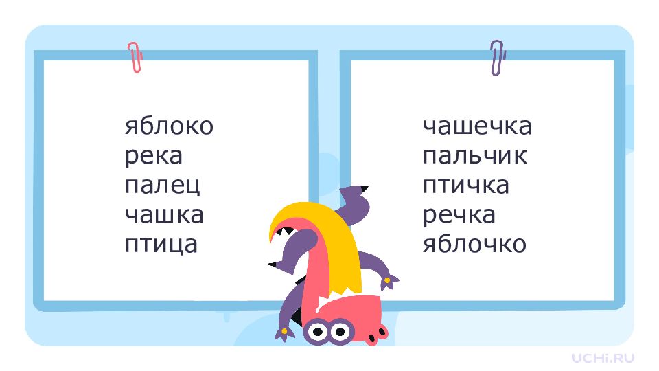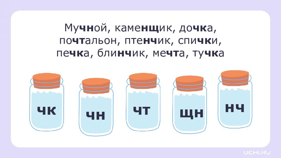 Му чн ой, каме нщ ик, до чк а, по чт альон, пте нч ик, спи чк и, пе чк а, бли нч ик, ме чт а, ту чк а чк чн чт щн нч