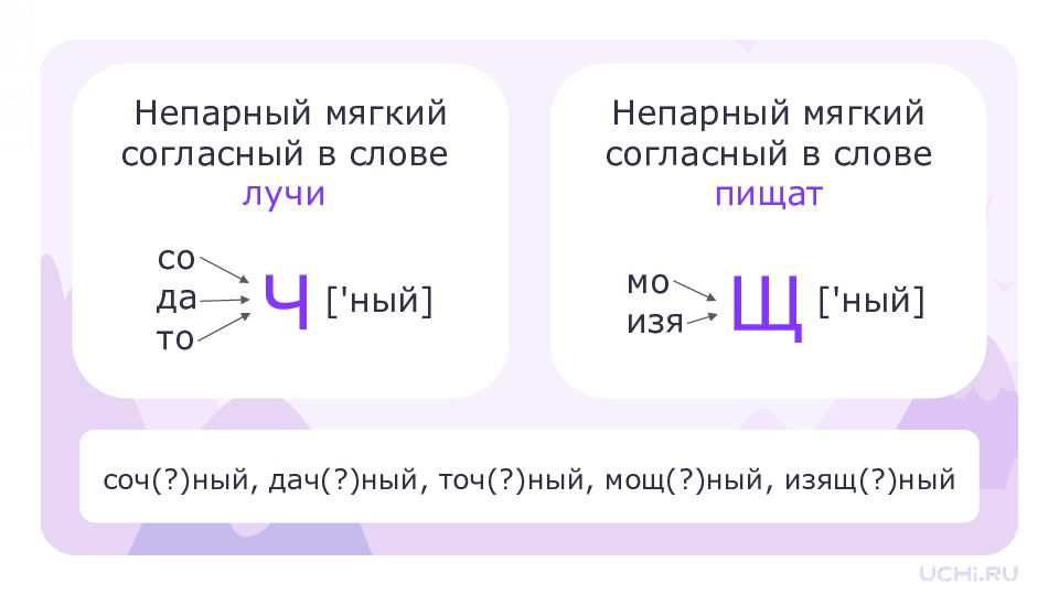 Непарный мягкий согласный в слове лучи мо изя Непарный мягкий согласный в слове пищат Ч Щ со да то ['ный] ['ный] соч(?)ный, дач(?)ный, точ(?)ный, мощ(?)ный, изящ(?)ный