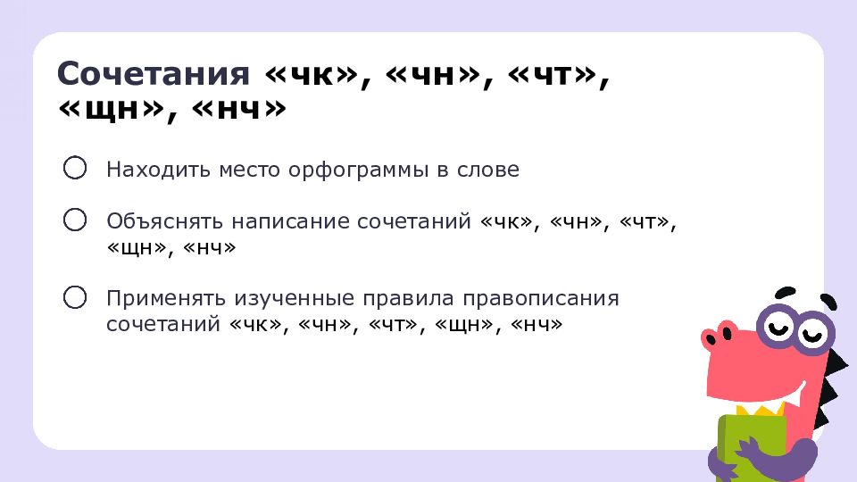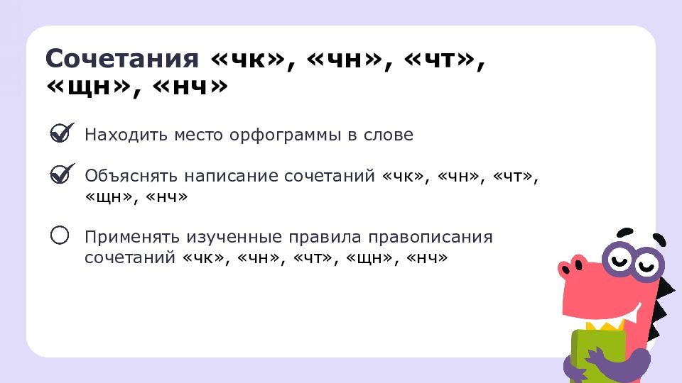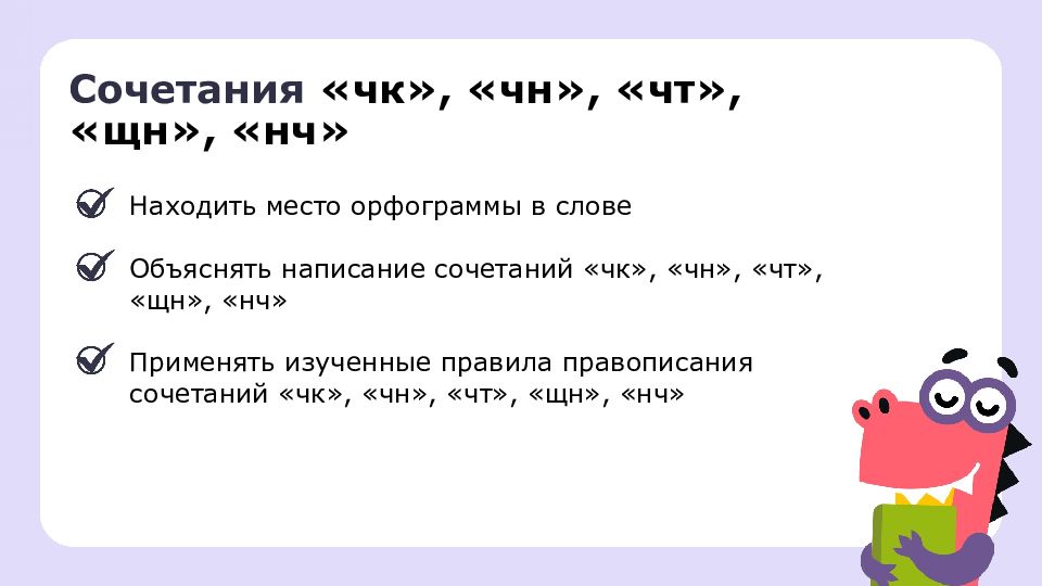 Сочетания «чк», «чн», «чт», «щн», «нч» Находить место орфограммы в слове Объяснять написание сочетаний «чк», «чн», «чт», «щн», «нч» Применять изученные правила правописания сочетаний «чк», «чн», «чт», «щн», «нч»