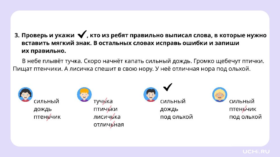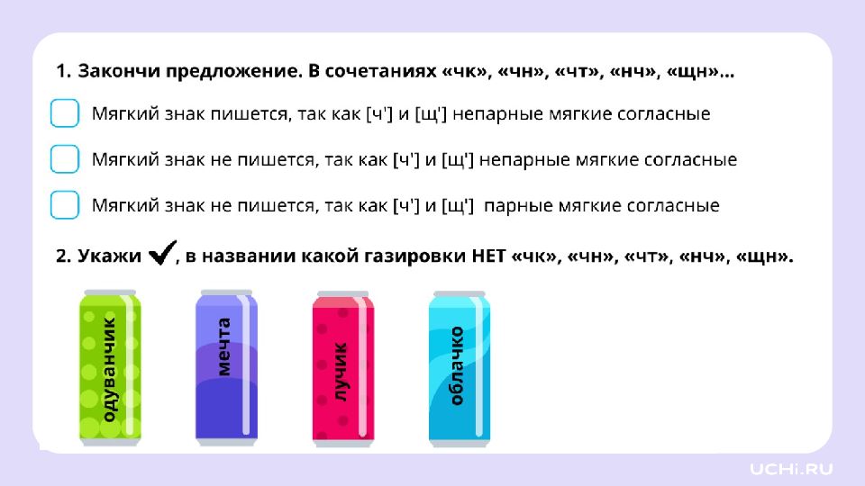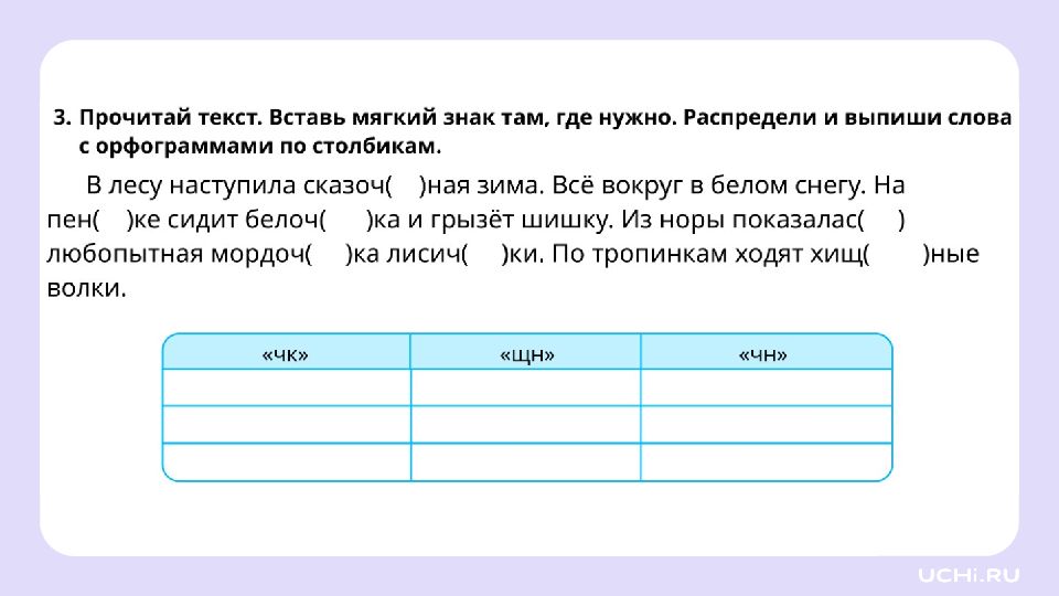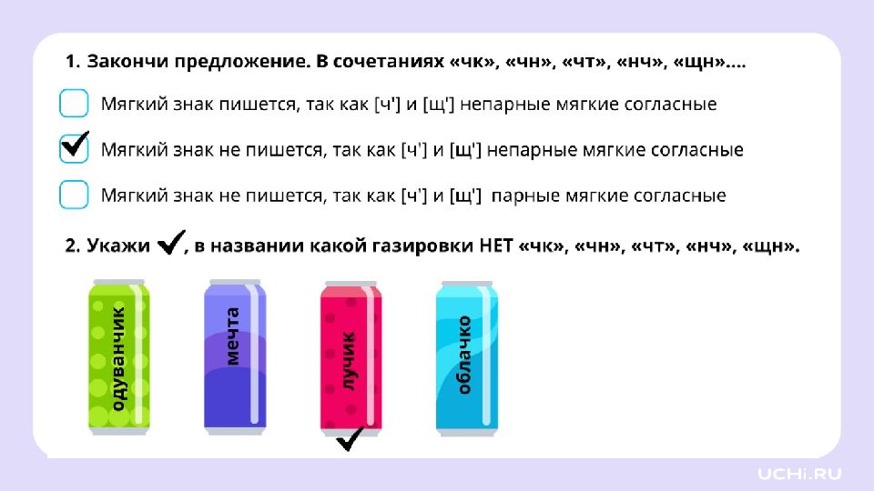 Запомните! Буквосочетания чк, чн, чт, щн, нч — это орфограммы. Эти сочетания всегда пишутся без мягкого знака.