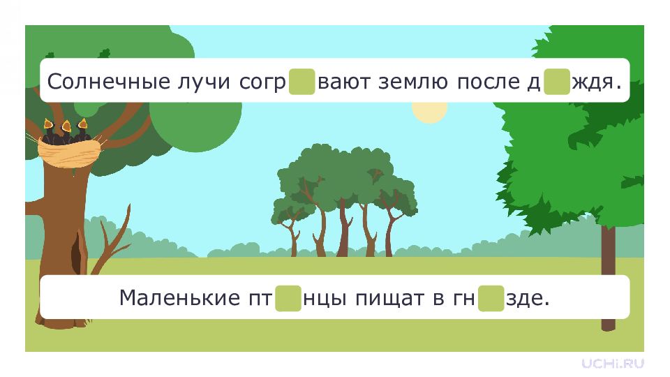 Солнечные лучи согр вают землю после д ждя. Маленькие пт нцы пищат в гн зде.