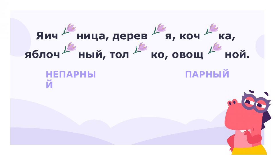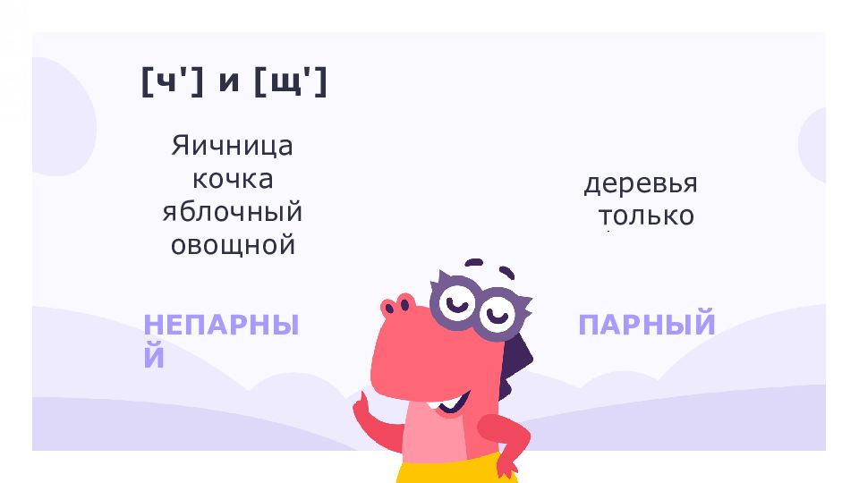 НЕПАРНЫЙ ПАРНЫЙ Яичница кочка яблочный овощной деревья только [ч'] и [щ']