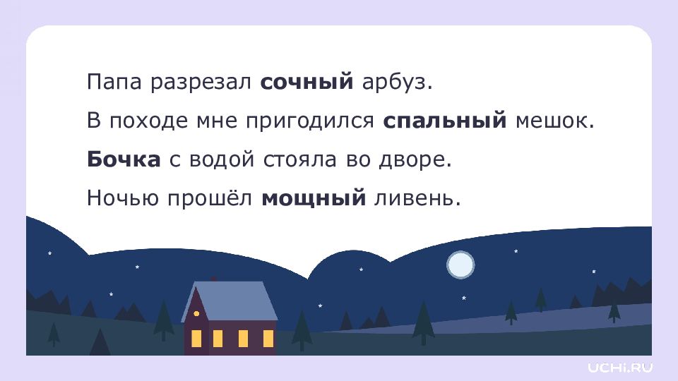 Папа разрезал сочный арбуз. В походе мне пригодился спал ь ный мешок. Бочка с водой стояла во дворе. Ночью прошёл мощный ливень.