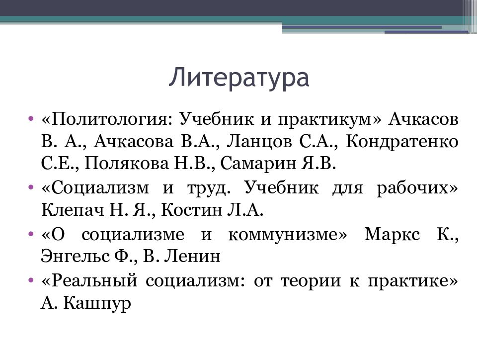 «Политология: Учебник и практикум» Ачкасов В. А., Ачкасова В.А., Ланцов С.А., Кондратенко С.Е., Полякова Н.В., Самарин Я.В. «Социализм и труд. Учебник для рабочих» Клепач Н. Я., Костин Л.А. «О социализме и коммунизме» Маркс К., Энгельс Ф., В. Ленин «Реальный социализм: от теории к практике» А. Кашпур