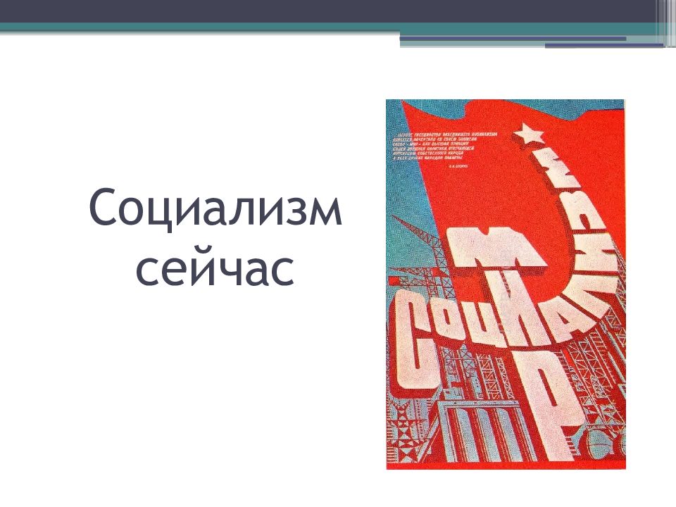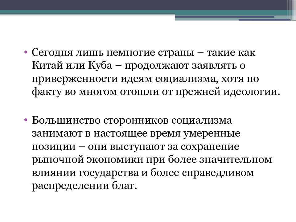 Сегодня лишь немногие страны – такие как Китай или Куба – продолжают заявлять о приверженности идеям социализма, хотя по факту во многом отошли от прежней идеологии. Большинство сторонников социализма занимают в настоящее время умеренные позиции – они выступают за сохранение рыночной экономики при более значительном влиянии государства и более справедливом распределении благ.