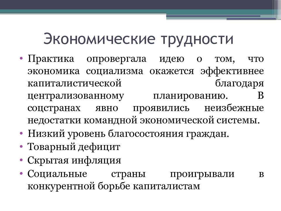 Практика опровергала идею о том, что экономика социализма окажется эффективнее капиталистической благодаря централизованному планированию. В соцстранах явно проявились неизбежные недостатки командной экономической системы. Низкий уровень благосостояния граждан. Товарный дефицит Скрытая инфляция Социальные страны проигрывали в конкурентной борьбе капиталистам