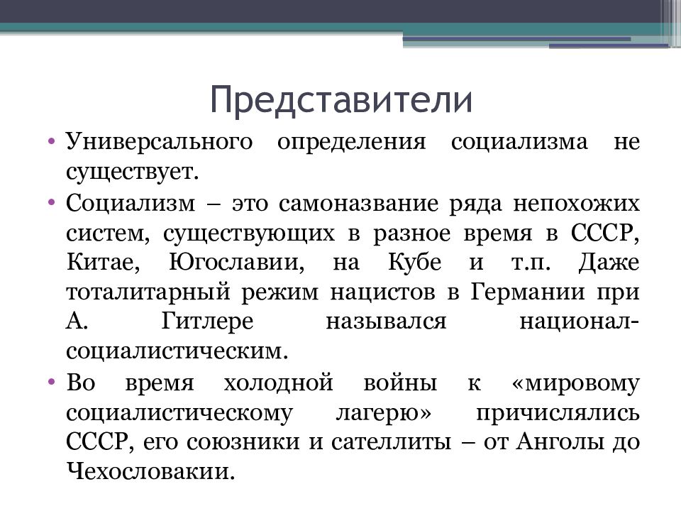 Универсального определения социализма не существует. Социализм – это самоназвание ряда непохожих систем, существующих в разное время в СССР, Китае, Югославии, на Кубе и т.п. Даже тоталитарный режим нацистов в Германии при А. Гитлере назывался национал-социалистическим. Во время холодной войны к «мировому социалистическому лагерю» причислялись СССР, его союзники и сателлиты – от Анголы до Чехословакии.