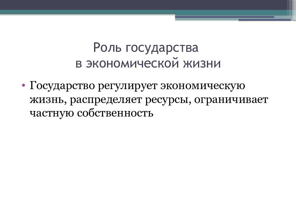 Государство регулирует экономическую жизнь, распределяет ресурсы, ограничивает частную собственность