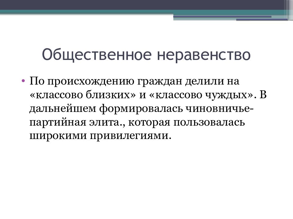 По происхождению граждан делили на «классово близких» и «классово чуждых». В дальнейшем формировалась чиновничье-партийная элита., которая пользовалась широкими привилегиями.