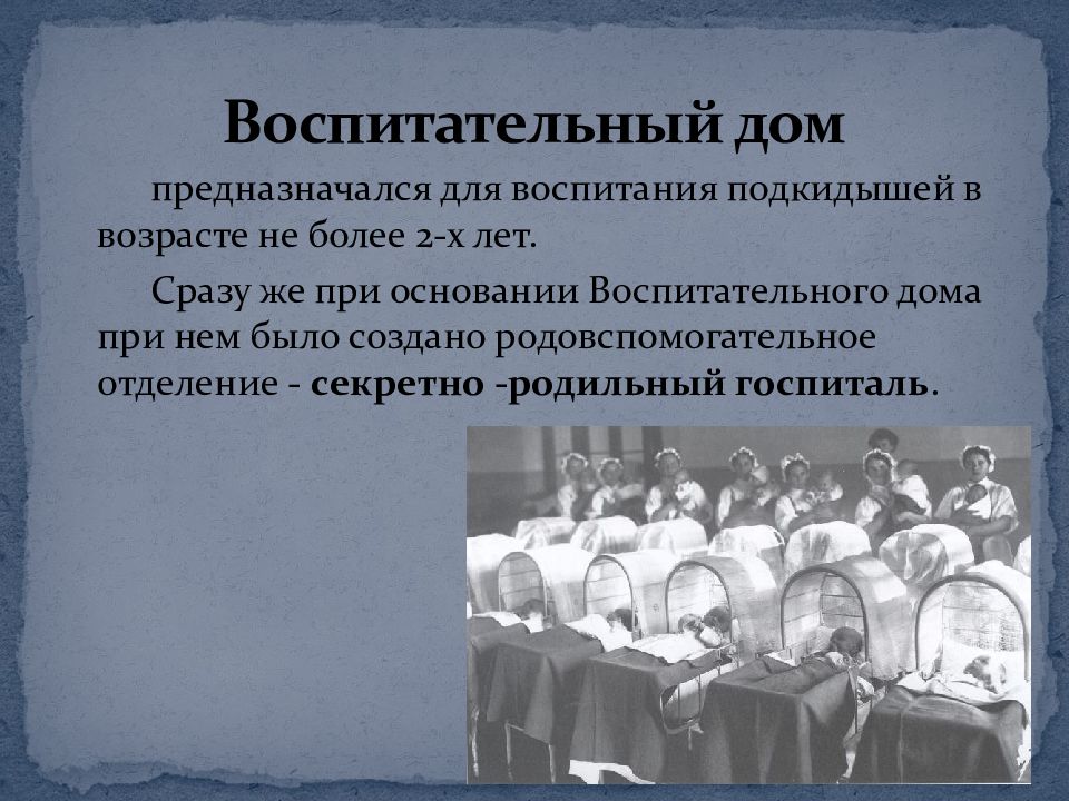 предназначался для воспитания подкидышей в возрасте не более 2-х лет. Сразу же при основании Воспитательного дома при нем было создано родовспомогательное отделение - секретно -родильный госпиталь. Воспитательный дом