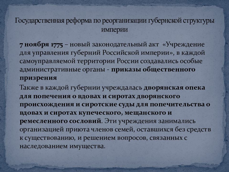 7 ноября 1775 – новый законодательный акт « Учреждение для управления губерний Российской империи», в каждой самоуправляемой территории России создавались особые административные органы - приказы общественного призрения Также в каждой губернии учреждалась дворянская опека для попечения о вдовах и сиротах дворянского происхождения и сиротские суды для попечительства о вдовах и сиротах купеческого, мещанского и ремесленного сословий. Эти учреждения занимались организацией приюта членов семей, оставшихся без средств к существованию, и решением вопросов, связанных с наследованием имущества. Государственная реформа по реорганизации губернской структуры империи