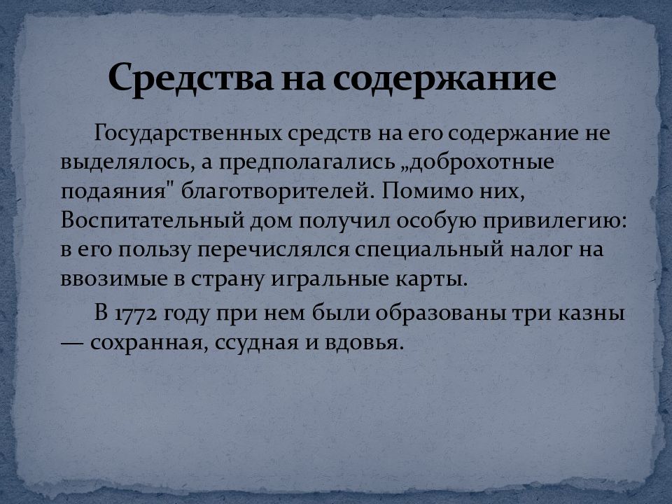 Государственных средств на его содержание не выделялось, а предполагались „доброхотные подаяния" благотворителей. Помимо них, Воспитательный дом получил особую привилегию: в его пользу перечислялся специальный налог на ввозимые в страну игральные карты. В 1772 году при нем были образованы три казны — сохранная, ссудная и вдовья. Средства на содержание