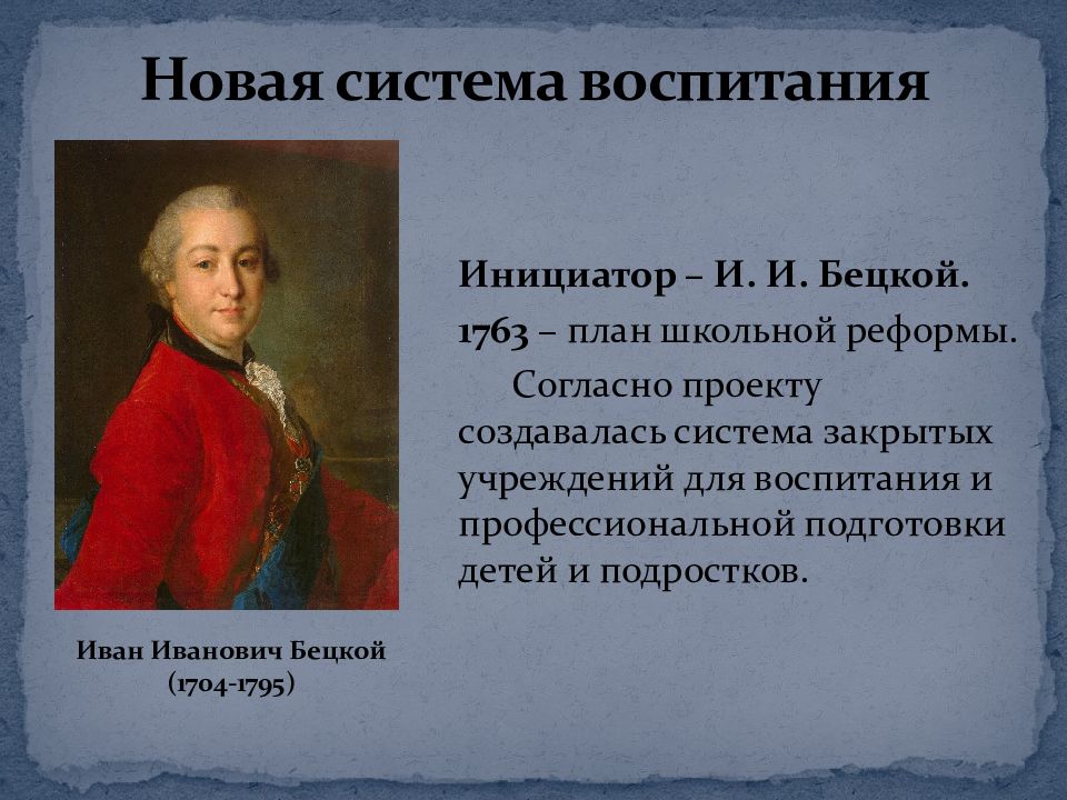 Инициатор – И. И. Бецкой. 1763 – план школьной реформы. Согласно проекту создавалась система закрытых учреждений для воспитания и профессиональной подготовки детей и подростков. Новая система воспитания Иван Иванович Бецкой (1704-1795)