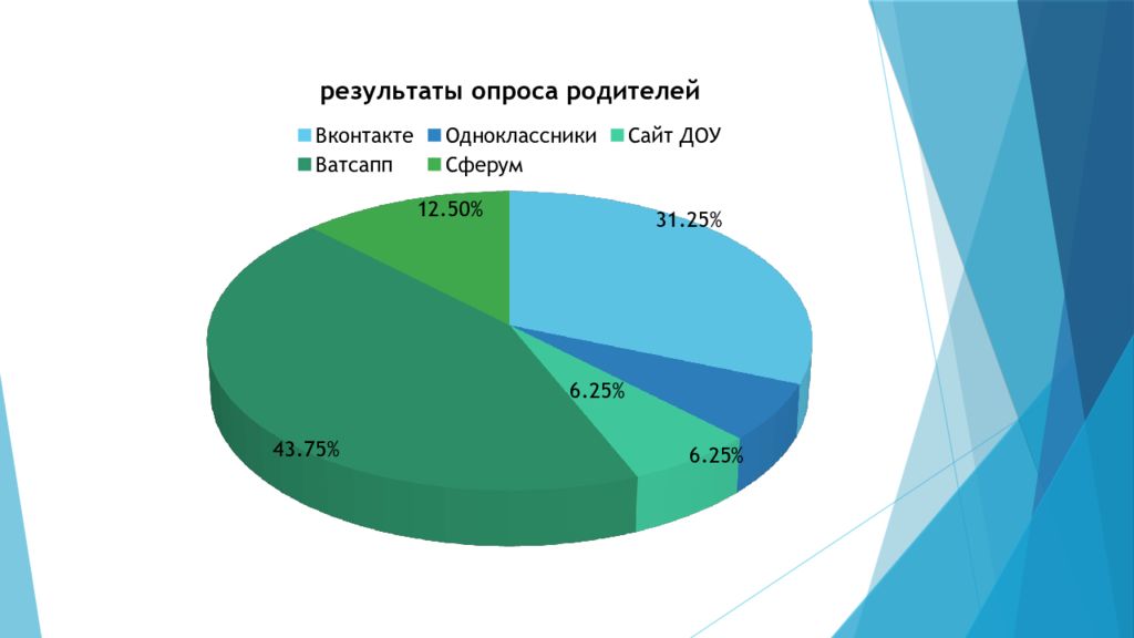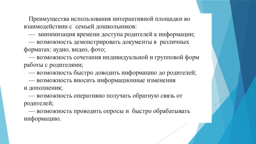 П реимущества использования интерактивной площадки во взаимодействии с семьей дошкольников: — минимизация времени доступа родителей к информации; — возможность демонстрировать документы в различных форматах: аудио, видео, фото; — возможность сочетания индивидуальной и групповой форм работы с родителями; — возможность быстро доводить информацию до родителей; — возможность вносить информационные изменения и дополнения; — возможность оперативно получать обратную связь от родителей; — возможность проводить опросы и быстро обрабатывать информацию.