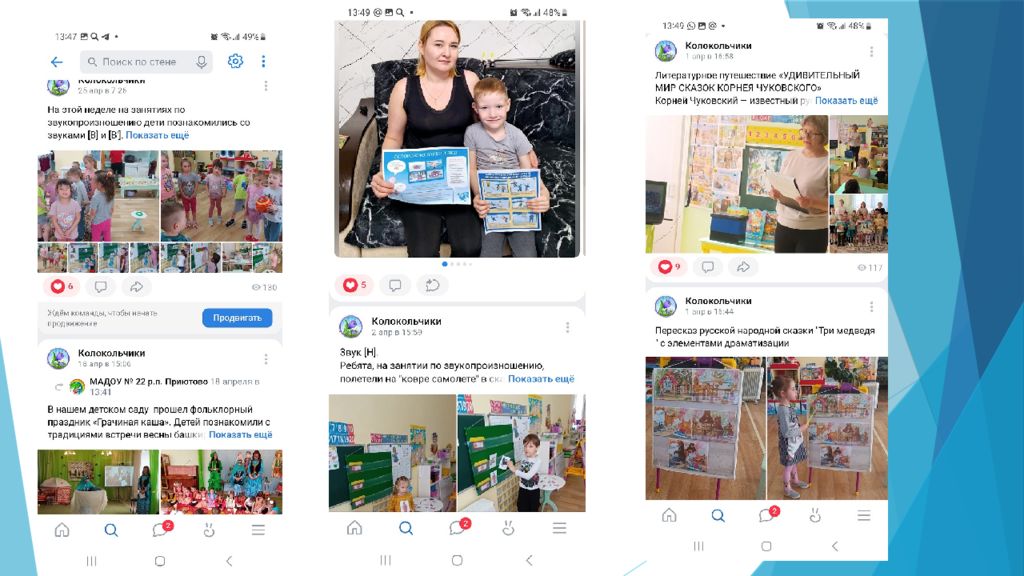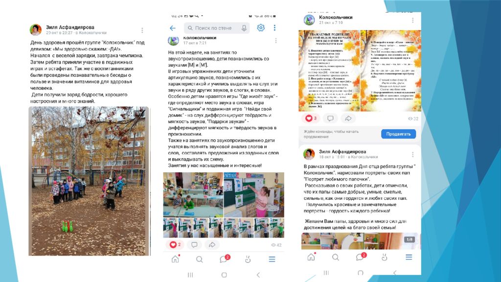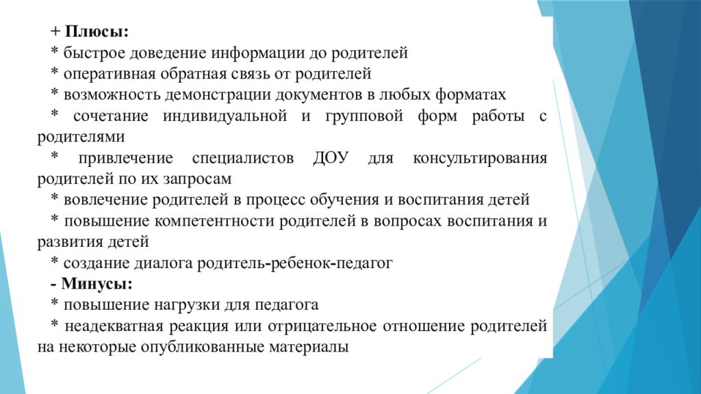 + Плюсы: * быстрое доведение информации до родителей * оперативная обратная связь от родителей * возможность демонстрации документов в любых форматах * сочетание индивидуальной и групповой форм работы с родителями * привлечение специалистов ДОУ для консультирования родителей по их запросам * вовлечение родителей в процесс обучения и воспитания детей * повышение компетентности родителей в вопросах воспитания и развития детей * создание диалога родитель - ребенок - педагог - Минусы: * повышение нагрузки для педагога * неадекватная реакция или отрицательное отношение родителей на некоторые опубликованные материалы