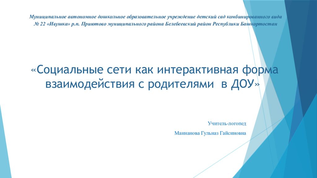 Учитель-логопед Маннанова Гульназ Гайсиновна Муниципальное автономное дошкольное образовательное учреждение детский сад комбинированного вида № 22 «Ивушка» р.п. Приютово муниципального района Белебеевский район Республики Башкортостан