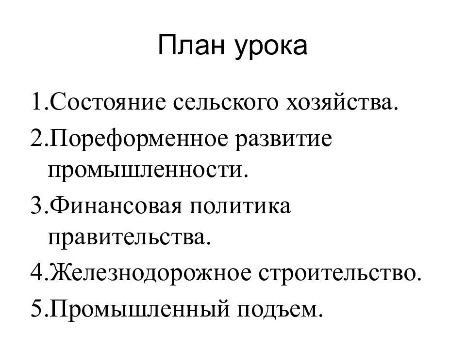 Состояние сельского хозяйства. Пореформенное развитие промышленности. Финансовая политика правительства. Железнодорожное строительство. Промышленный подъем.