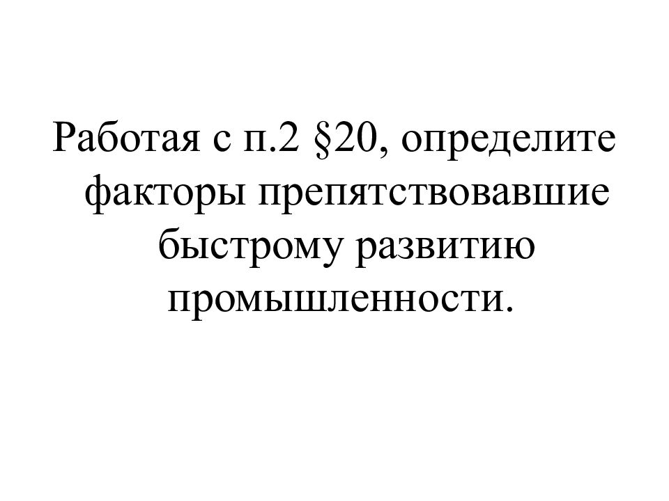 Работая с п.2 §20, определите факторы препятствовавшие быстрому развитию промышленности.