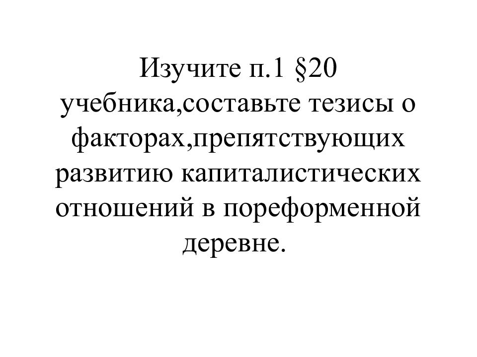 Изучите п.1 §20 учебника,составьте тезисы о факторах,препятствующих развитию капиталистических отношений в пореформенной деревне.