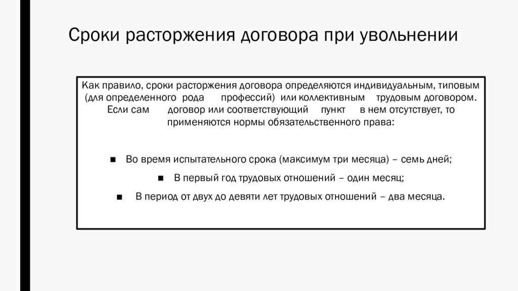 Как правило, сроки расторжения договора определяются индивидуальным, типовым (для определенного рода профессий) или коллективным трудовым договором. Если сам договор или соответствующий пункт в нем отсутствует, то применяются нормы обязательственного права: Во время испытательного срока (максимум три месяца ) – семь дней; В первый год трудовых отношений – один месяц ; В период от двух до девяти лет трудовых отношений – два месяца.
