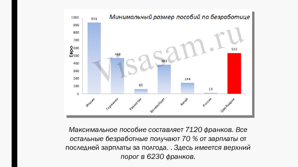 Максимальное пособие составляет 7120 франков. Все остальные безработные получают 70 % от зарплаты от последней зарплаты за полгода.. Здесь имеется верхний порог в 6230 франков.
