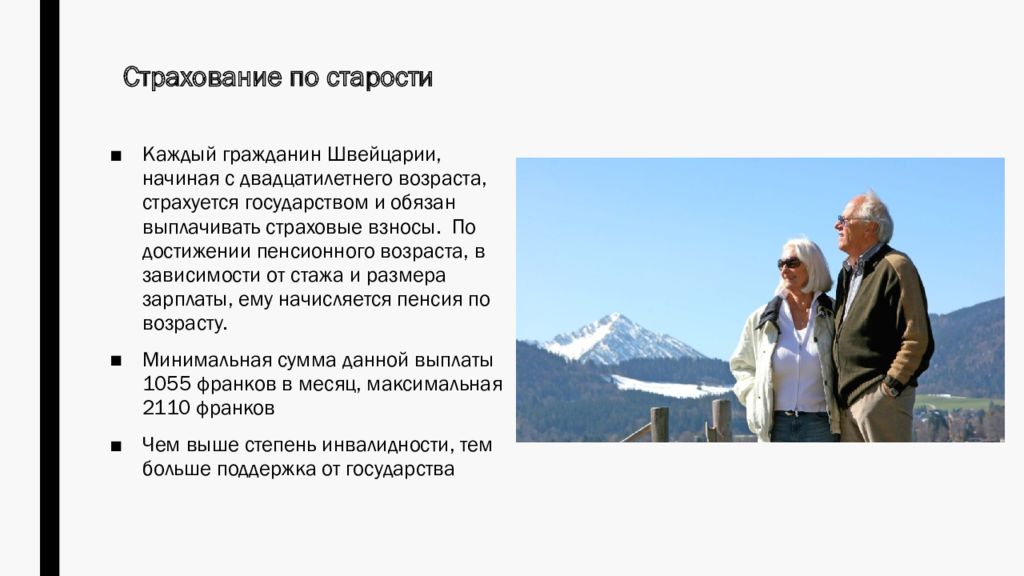 Каждый гражданин Швейцарии, начиная с двадцатилетнего возраста, страхуется государством и обязан выплачивать страховые взносы. По достижении пенсионного возраста, в зависимости от стажа и размера зарплаты, ему начисляется пенсия по возрасту. Минимальная сумма данной выплаты 1055 франков в месяц, максимальная 2110 франков Ч ем выше степень инвалидности, тем больше поддержка от государства