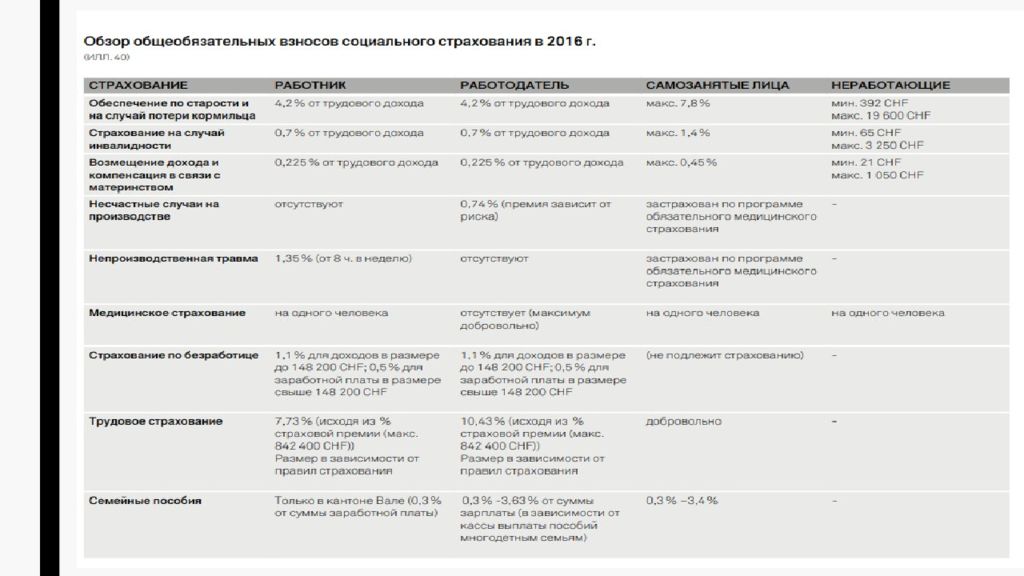 К аждый гражданин Швейцарии должен иметь: медицинскую страховку, в том числе от несчастных случаев страхование по старости страхование по потере кормилица страхование по инвалидности и так далее Кстати подобные страхования здесь называются страхованием второго уровня, первый это страхование на случай безработицы Иностранные граждане также должны застраховаться в течение трех месяцев по приезду в страну