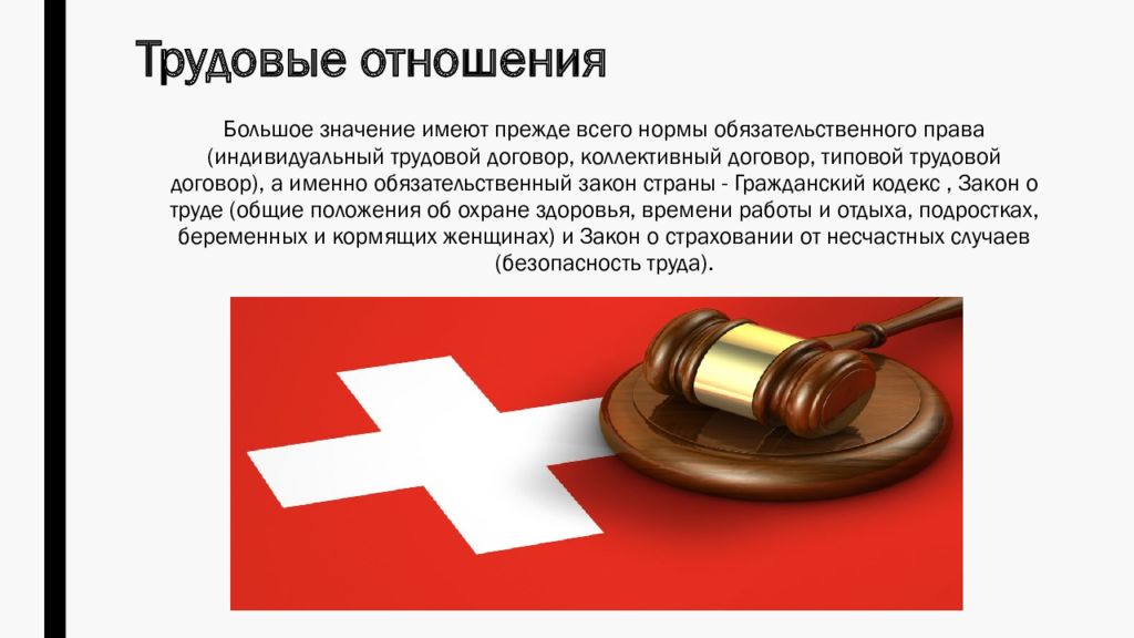 Большое значение имеют прежде всего нормы обязательственного права (индивидуальный трудовой договор, коллективный договор, типовой трудовой договор), а именно обязательственный закон страны - Гражданский кодекс, Закон о труде (общие положения об охране здоровья, времени работы и отдыха, подростках, беременных и кормящих женщинах) и Закон о страховании от несчастных случаев (безопасность труда).