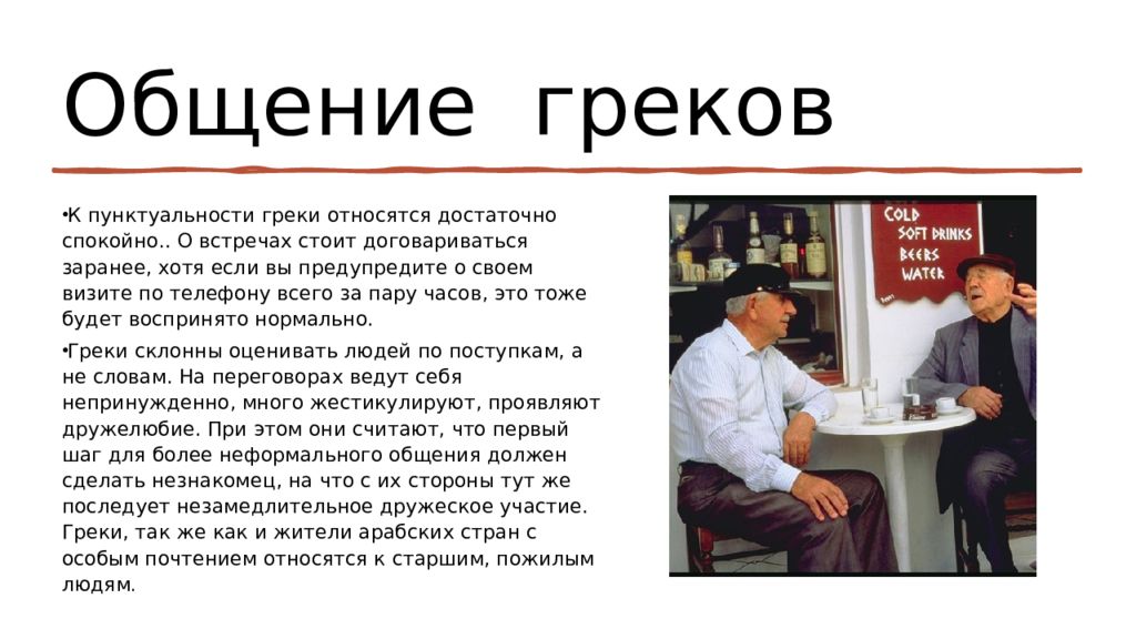 К пунктуальности греки относятся достаточно спокойно.. О встречах стоит договариваться заранее, хотя если вы предупредите о своем визите по телефону всего за пару часов, это тоже будет воспринято нормально. Греки склонны оценивать людей по поступкам, а не словам. На переговорах ведут себя непринужденно, много жестикулируют, проявляют дружелюбие. При этом они считают, что первый шаг для более неформального общения должен сделать незнакомец, на что с их стороны тут же последует незамедлительное дружеское участие. Греки, так же как и жители арабских стран с особым почтением относятся к старшим, пожилым людям.