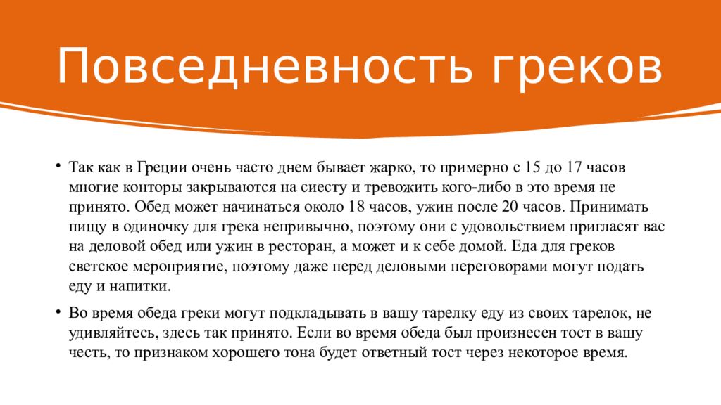 Так как в Греции очень часто днем бывает жарко, то примерно с 15 до 17 часов многие конторы закрываются на сиесту и тревожить кого-либо в это время не принято. Обед может начинаться около 18 часов, ужин после 20 часов. Принимать пищу в одиночку для грека непривычно, поэтому они с удовольствием пригласят вас на деловой обед или ужин в ресторан, а может и к себе домой. Еда для греков светское мероприятие, поэтому даже перед деловыми переговорами могут подать еду и напитки. Во время обеда греки могут подкладывать в вашу тарелку еду из своих тарелок, не удивляйтесь, здесь так принято. Если во время обеда был произнесен тост в вашу честь, то признаком хорошего тона будет ответный тост через некоторое время.