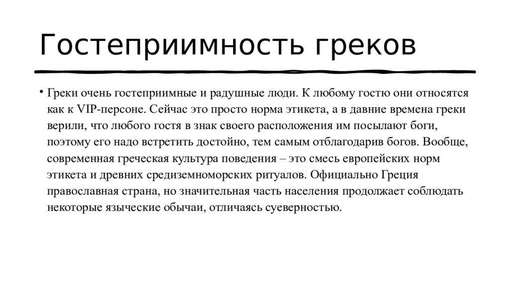 Греки очень гостеприимные и радушные люди. К любому гостю они относятся как к VIP-персоне. Сейчас это просто норма этикета, а в давние времена греки верили, что любого гостя в знак своего расположения им посылают боги, поэтому его надо встретить достойно, тем самым отблагодарив богов. Вообще, современная греческая культура поведения – это смесь европейских норм этикета и древних средиземноморских ритуалов. Официально Греция православная страна, но значительная часть населения продолжает соблюдать некоторые языческие обычаи, отличаясь суеверностью.