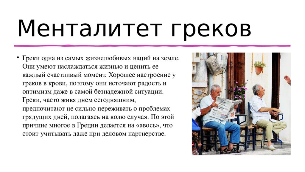 Греки одна из самых жизнелюбивых наций на земле. Они умеют наслаждаться жизнью и ценить ее каждый счастливый момент. Хорошее настроение у греков в крови, поэтому они источают радость и оптимизм даже в самой безнадежной ситуации. Греки, часто живя днем сегодняшним, предпочитают не сильно переживать о проблемах грядущих дней, полагаясь на волю случая. По этой причине многое в Греции делается на «авось», что стоит учитывать даже при деловом партнерстве.