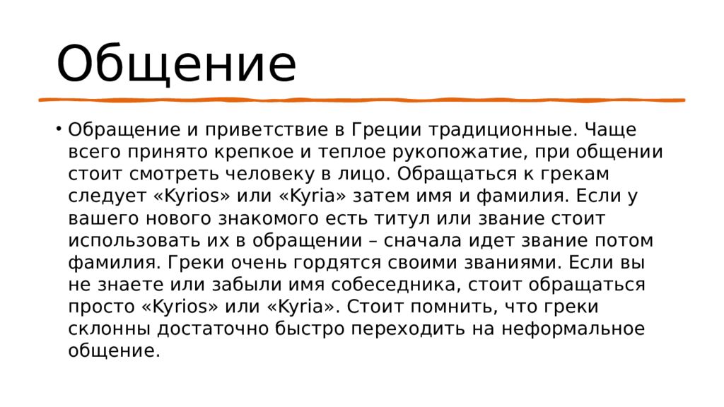 Обращение и приветствие в Греции традиционные. Чаще всего принято крепкое и теплое рукопожатие, при общении стоит смотреть человеку в лицо. Обращаться к грекам следует « Kyrios » или « Kyria » затем имя и фамилия. Если у вашего нового знакомого есть титул или звание стоит использовать их в обращении – сначала идет звание потом фамилия. Греки очень гордятся своими званиями. Если вы не знаете или забыли имя собеседника, стоит обращаться просто « Kyrios » или « Kyria ». Стоит помнить, что греки склонны достаточно быстро переходить на неформальное общение.